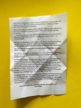Die Pandemie hat viele schwelende Konflikte verschärft. So führte sie in Deutschland zu einer neuen Form der Ausgrenzung und Diskriminierung gegenüber Menschen asiatischer Herkunft, weil das Virus aus China kam. Niemand wollte die gleiche Luft atmen, die gleichen Oberflächen anfassen wie sie, hektisch wurde in ihrer Nähe Desinfektionsmittel hervorgekramt und der hysterische Warn-Ruf „Corona“ begleitete ihren Alltag. Ju Hyuun Hwang macht diese Erlebnisse aus jener Zeit in ihrer interaktiven Installation für die Besucher*innen erfahrbar. Wie fühlt es sich an, willkürlich in der Öffentlichkeit beschmutzt zu werden? Was macht ein Stigma mit einem? Für einen Augenblick lässt die Designerin uns an ihrer Erfahrung teilhaben.